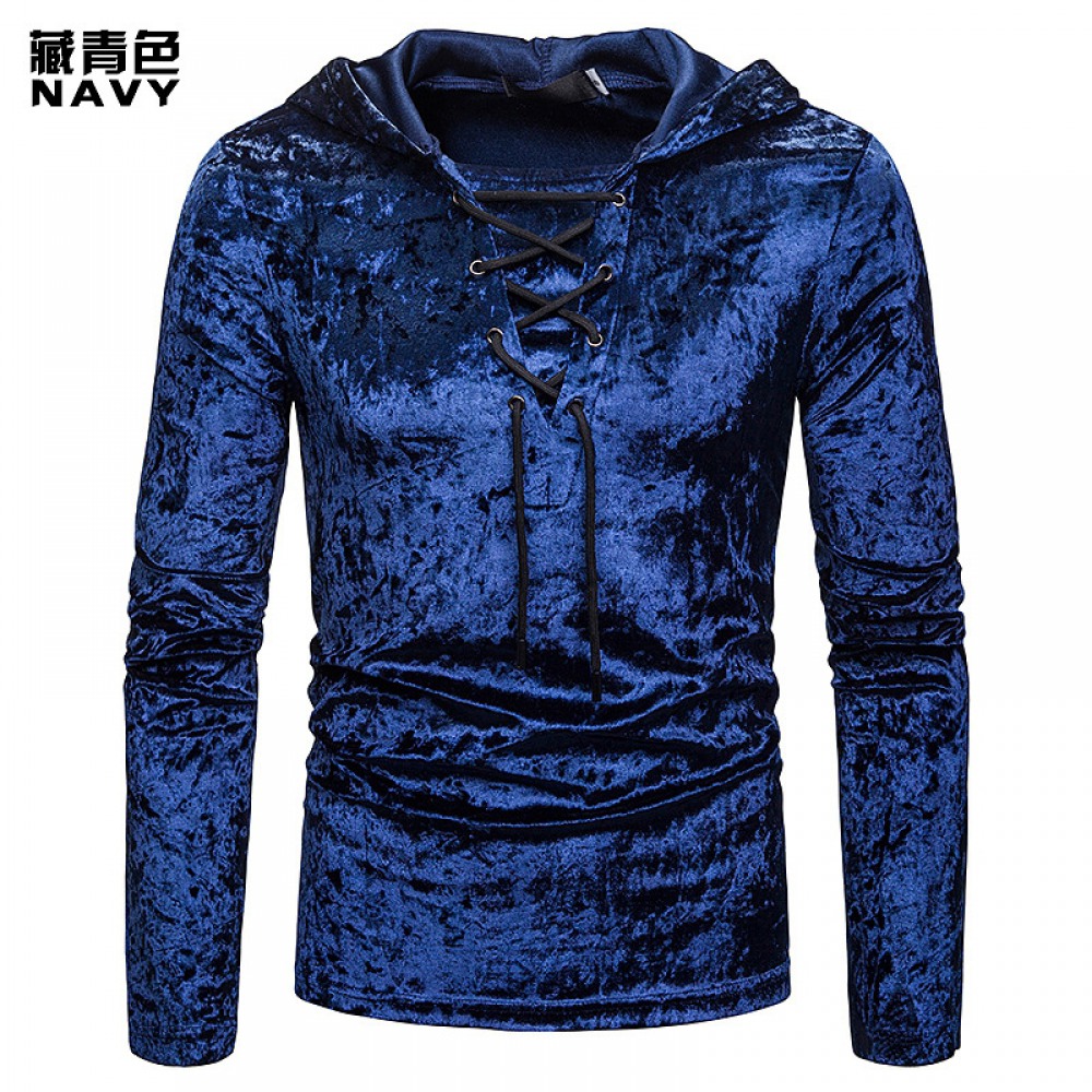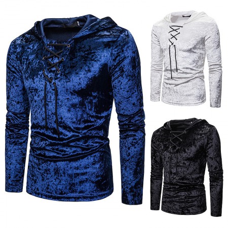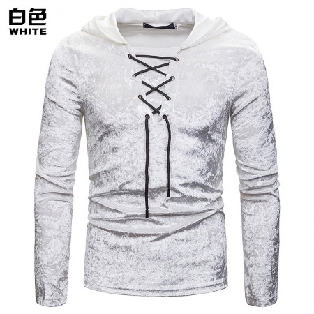 New Men's Diamond Velvet European Size Loose Shoelace Hooded Long Sleeve T-Shirt