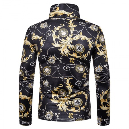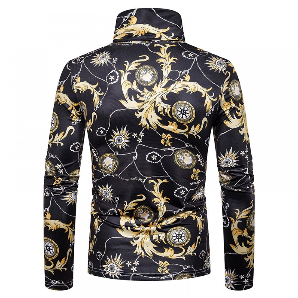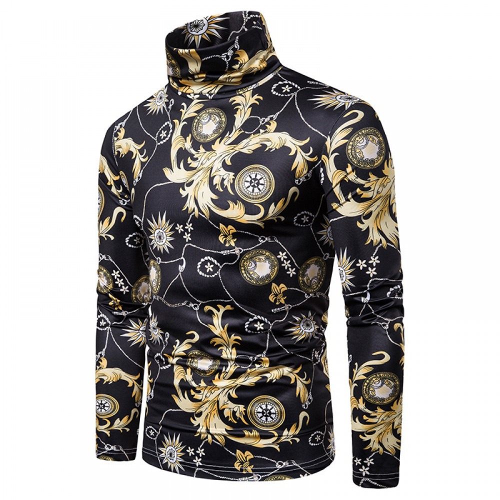 New Men's Large Size 3D Retro Large Pattern Print High Neck Long Sleeve T-Shirt Bottoming Shirt